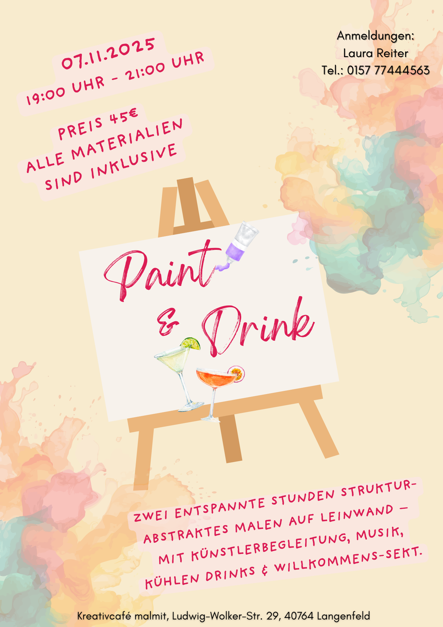 7. November : 19:00 - 21:00 Paint & Drink – Malkurs mit künstlerischen Begleitung Cafe Malmit Ludwig-Wolker-Straße 29, Langenfeld (Rheinland) 45,00€